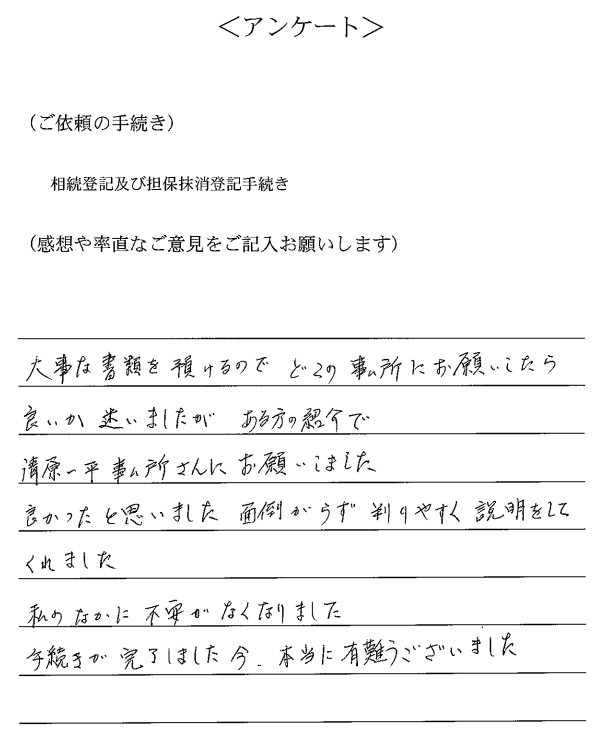ご依頼通りのお手続きが完了し、安心しました。